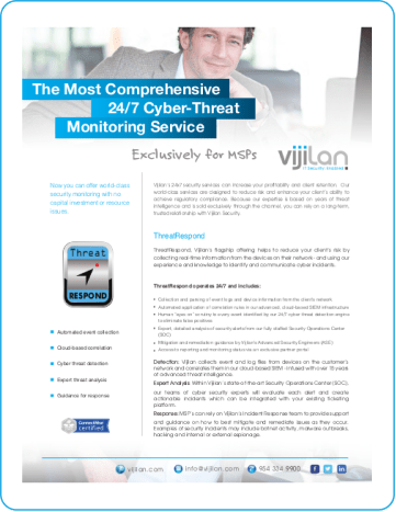 Vijilanโs 24×7 security services can increase your profitability and client retention. Our world-class services are designed to reduce risk and enhance your clientโs ability to achieve regulatory compliance. Because our expertise is based on years of threat intelligence and is sold exclusively through the channel, you can rely on a long-term, trusted relationship with Vijilan Security